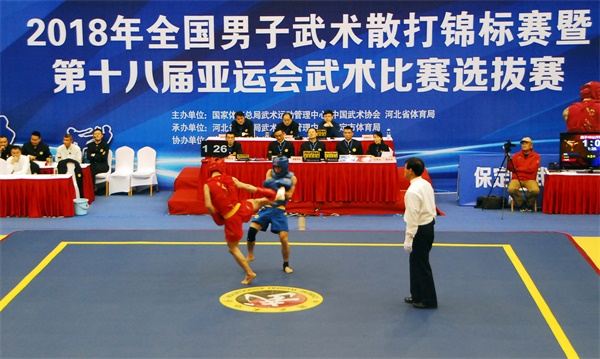 由国家体育总局武术运动管理中心主办的2018年全国男子武术散打锦标赛暨第十八届亚运会武术比赛选拔赛,于4月11日至15日在河北省保定市举行,共有来自全国各省、直辖市、体育院校和行业体协的45支代表队381名运动员参赛,比赛采用单败淘汰制,设12个级别。
