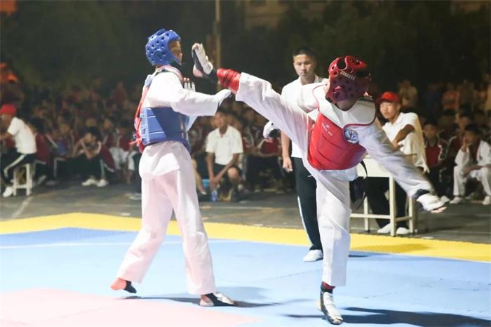跆拳道场地上的比赛一样精彩,身穿护具的选手们个个腿法了得,有效击打频频命中对手得分。