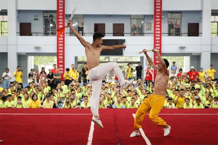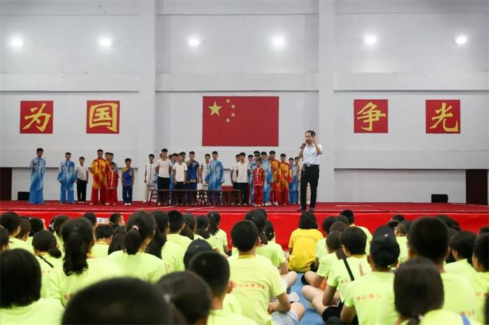 精彩的武术表演之后,共青团塔沟武校团委书记董洪涛对各位同学的到来再次致以欢迎,声情并茂地述说了台上演练少林十八般武艺的塔沟小子们平时刻苦练功的经历,号召大家学习他们不怕吃苦,奋勇拼搏的精神,发自肺腑的深情演讲获得了现场小观众的一致认可。