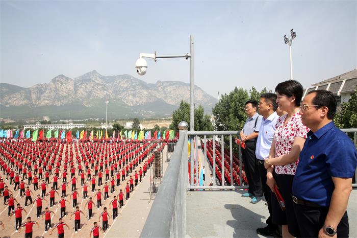 6月7日上午,郑州市委常委、组织部长焦豫汝带领郑州市各开发区、县(市)区委组织部长、非公办主任、工商局、民政局党组书记、局长等130人到塔沟武校考察党建工作。