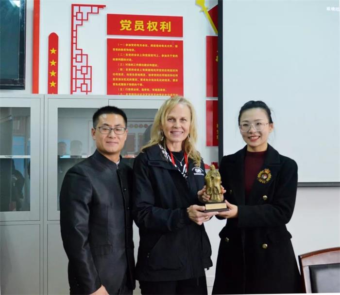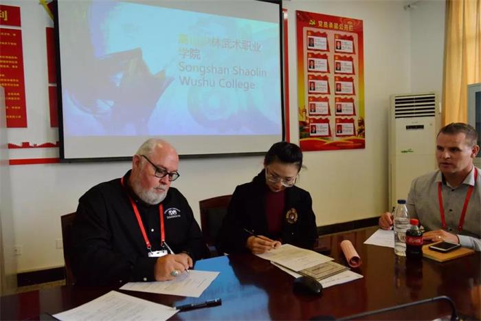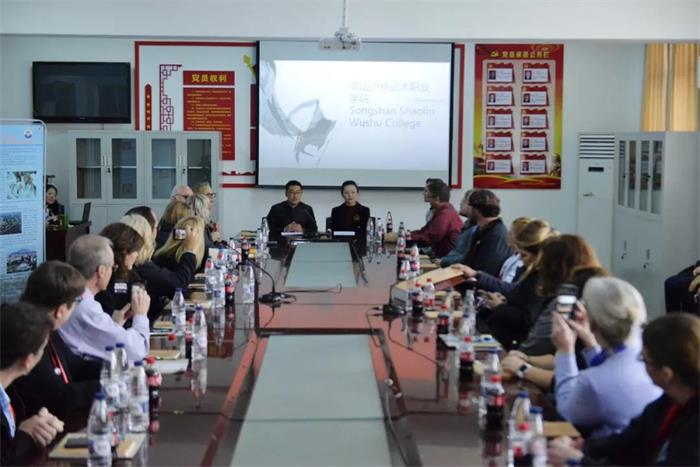最后,在会议室,校长团成员与学院领导进行了会谈。学院院长助理刘少菲向校长们介绍了学院及汉语国际推广少林武术基地的历史、概况和近年来在国际交流方面做出的成绩。简短而精彩的发言让校长团成员对学院有了更加深入和全面的了解。座谈会上,校长团成员们与学院领导就学院的办学理念、课程设置、专业设置等问题进行了详细的交流。同时,他们也表达了强烈的合作意愿,并现场与我院签订了合作备忘录。临别之际,校长团代表与学院领导互赠礼物,并合影留念。